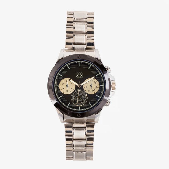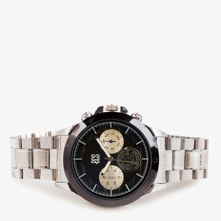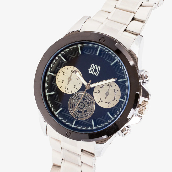 This analogue watch features a sophisticated round dial with bold markers and multiple sub-dials for added functionality. The metallic strap complements the classic face, creating a refined and...